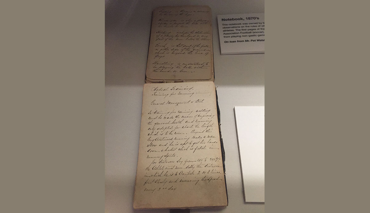 这是 Maurice Davin 的笔记本,记录了有关其他运动的规则、饮食规划、其他运动员所创记录的手写记述。笔记本的前几页,包含协会足球规则。 早在1885年,盖尔运动协会“禁止”会员从事非盖尔运动